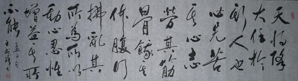 释文:天将降大任于是人也,必先若其心志,劳其筋骨,饿其体肤,行拂乱其所为,所以动心忍性,曾益其所不能。 2014年5月15日书于哈尔滨所乐斋。
